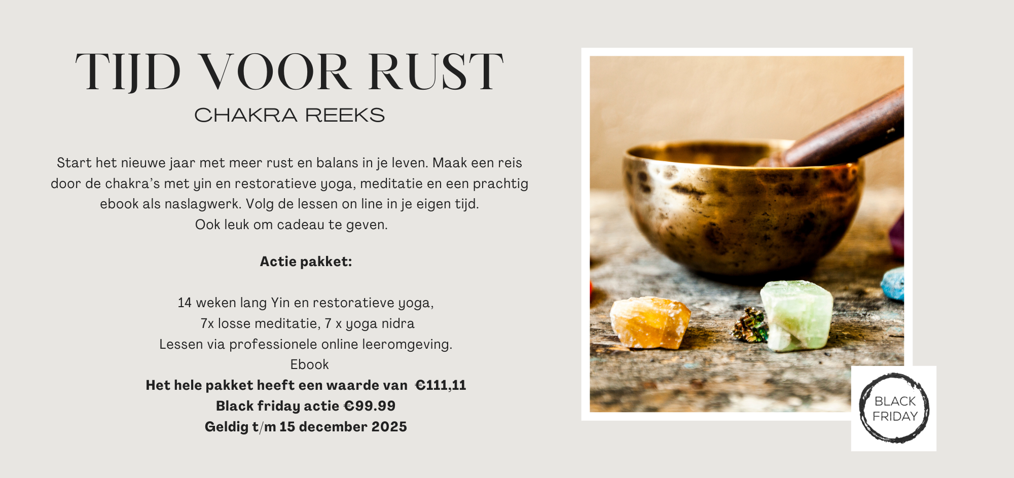 We starten op 5 januari 2026 en neem ik je stap voor stap mee in de chakra reeks met restorative yoga en yin yoga meditatie. Zachte vormen van yoga die je lichaam herstellen, je adem verdiepen en je hoofd weer helder maken. Zo komen de chakra,s in balans. Start het nieuwe jaar met deze chakra reeks
